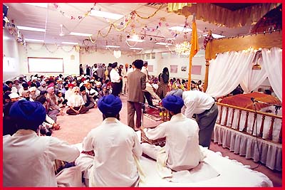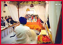 ![]() The sounds of kirtan are heard as people enter and pay their respects before Sri Guru Granth Sahib. |