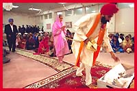 ![]() The groom and his parents enter and he presents a cash offering as well as a rumala, a new silk covering for Sri Guru Granth Sahib. |